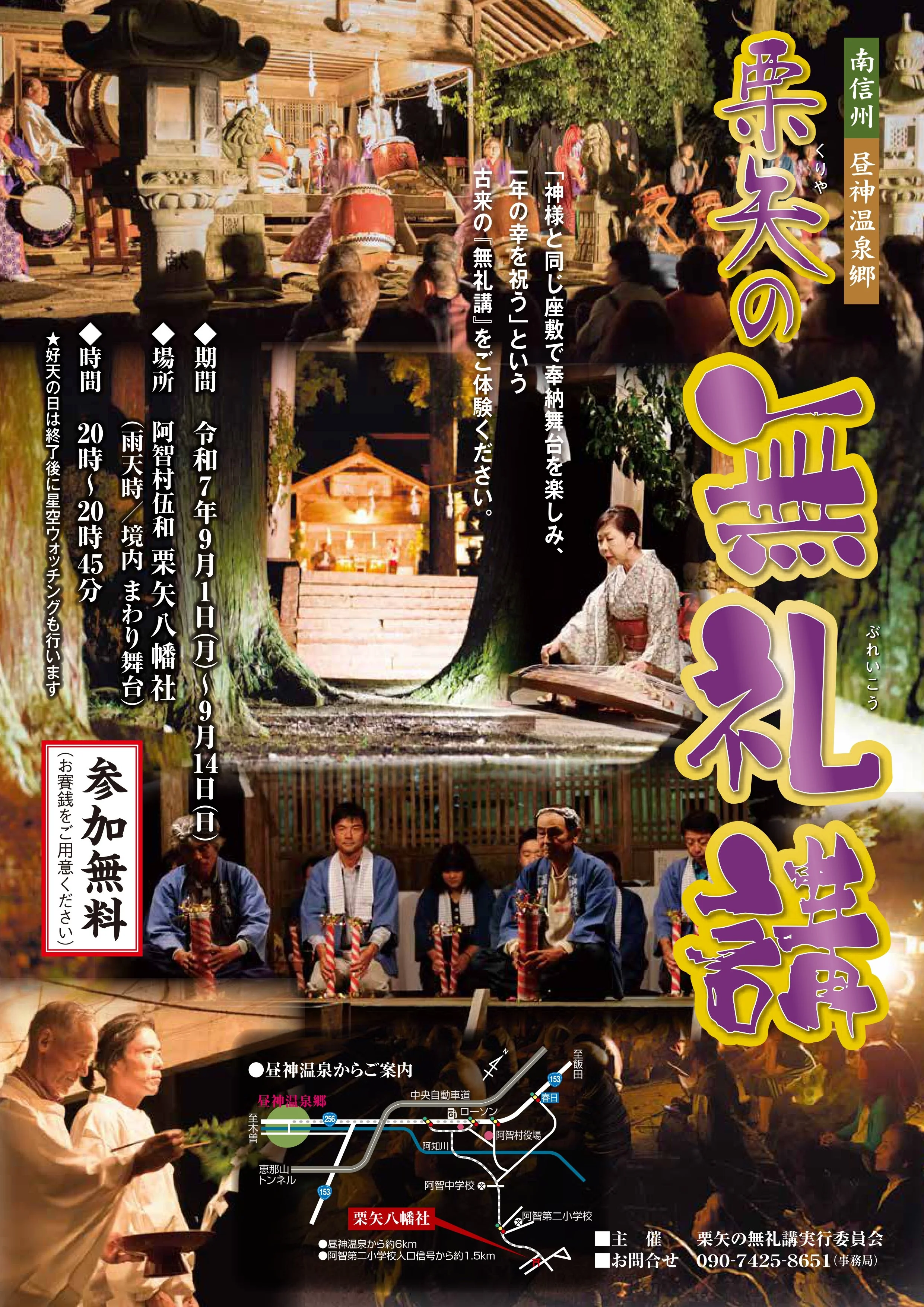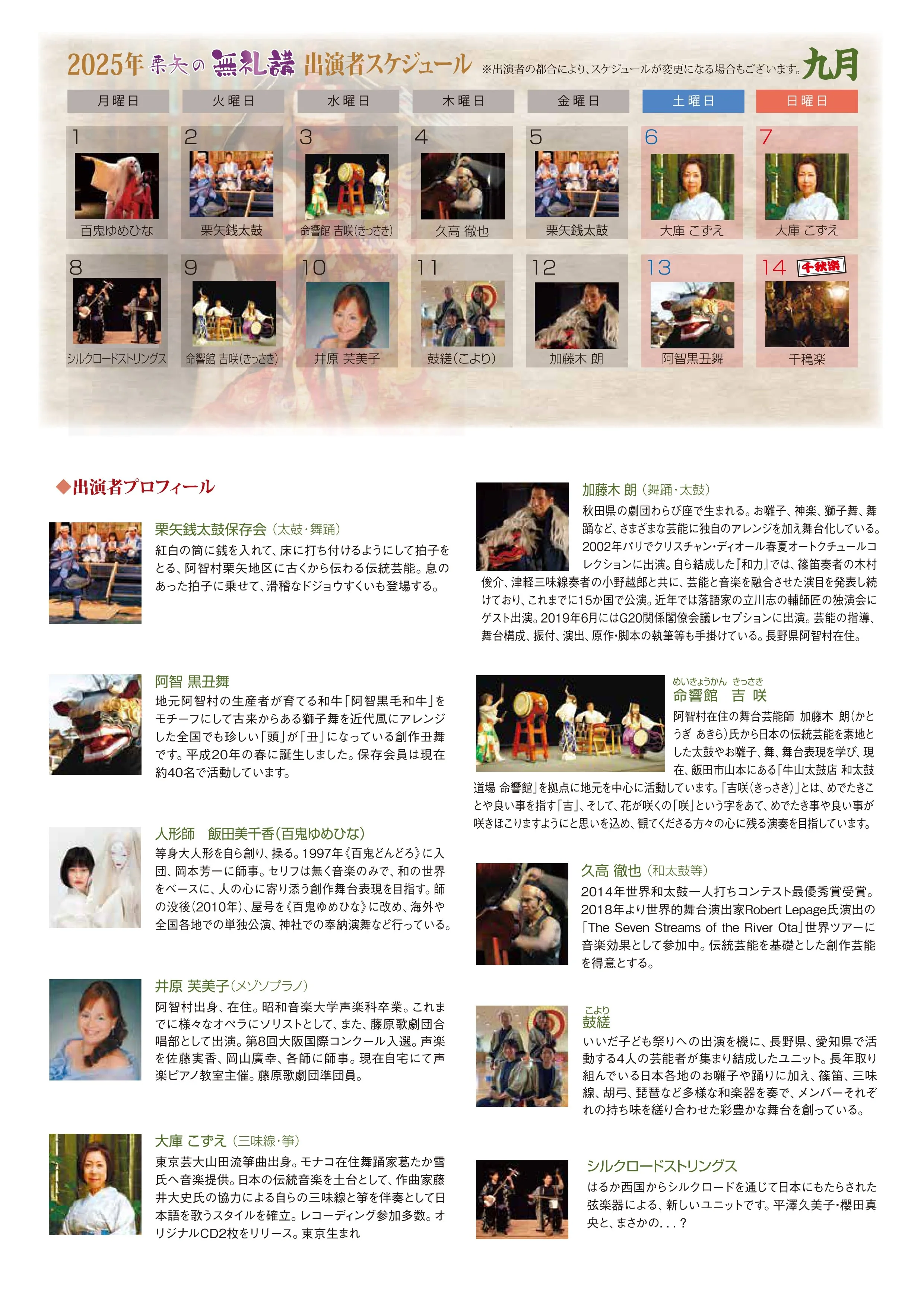 栗矢の無礼講【加藤木 朗】 Friday, September 12, 2025 8:00 PM 8:45 PM 20:00 20:45 Google Calendar ICS View fullsize View fullsize 日時: 9月12日 (木) 午後8時頃 〜 8時45分会場: 阿智村伍和 栗矢八幡神社(雨天時:境内 まわり舞台)出演:鼓縒(加藤木 朗、櫻田真央、平澤久美子)参加無料(投げ銭歓迎) View fullsize