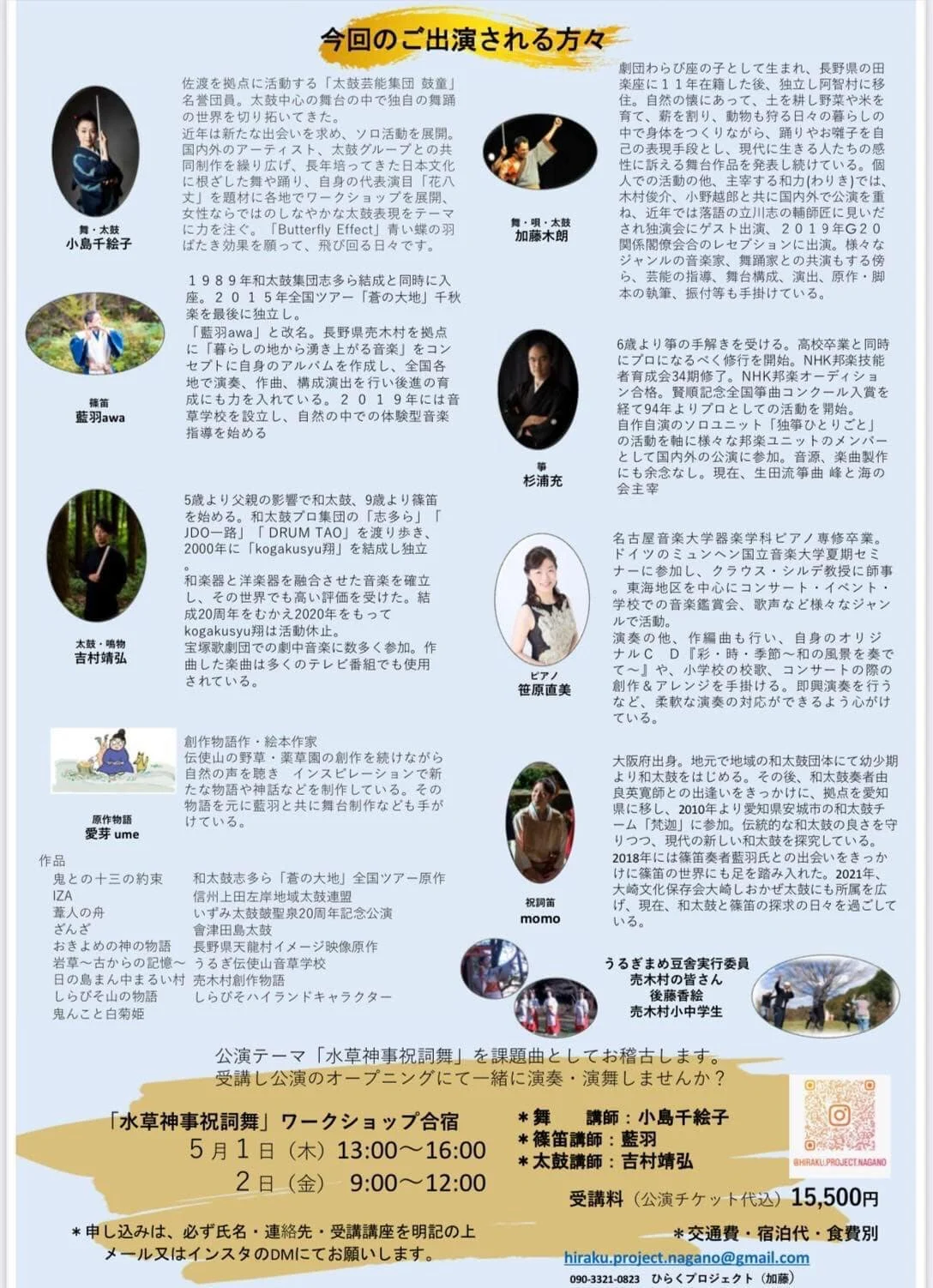 【出演】藍羽awa (篠笛)、加藤木 朗 (舞・唄・太鼓)、小島千絵子 (舞・太鼓)、笹原直美 (ピアノ)、杉浦 充 (箏)、momo (祝詞笛)、吉村靖弘 (太鼓・鳴物)