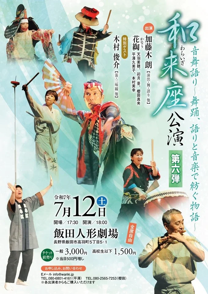 加藤木 朗率いる南信州発のユニット花綯(かなう)がつくる芸能てんこ盛りの「和来座」は、飯田・下伊那の定番となった大好評の公演。今年は第六弾です。