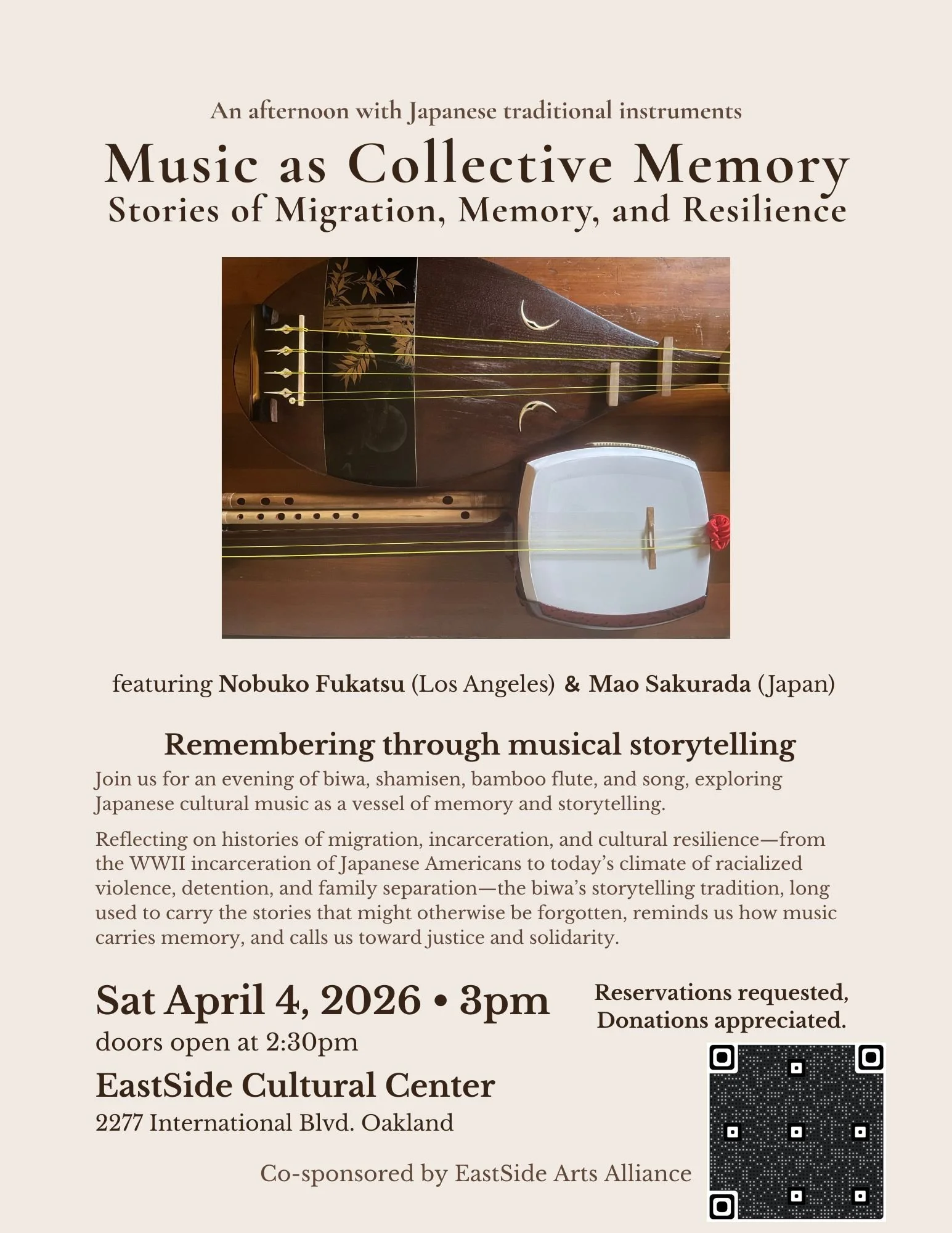 We'll perform pieces inspired by Japanese folk music using traditional instruments (biwa, shamisen, shinobue) that evoke memories and stories from our community.